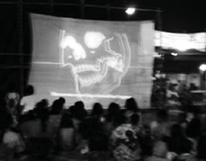 The screening was held on Sunday night, 27 July 208 in Ratmakan. It was a success despite of the appearance of ghosts at our party. The place we used is a vacant lot which is a base camp of the Code ghosts, says the local ghost buster. Besides, it is near to the Ghost Palace which is located at the south bridge. When we did the screening, unexpectedly the film was stuck in the middle.